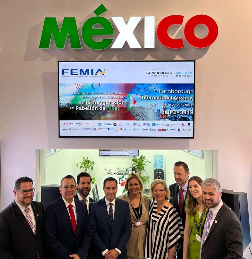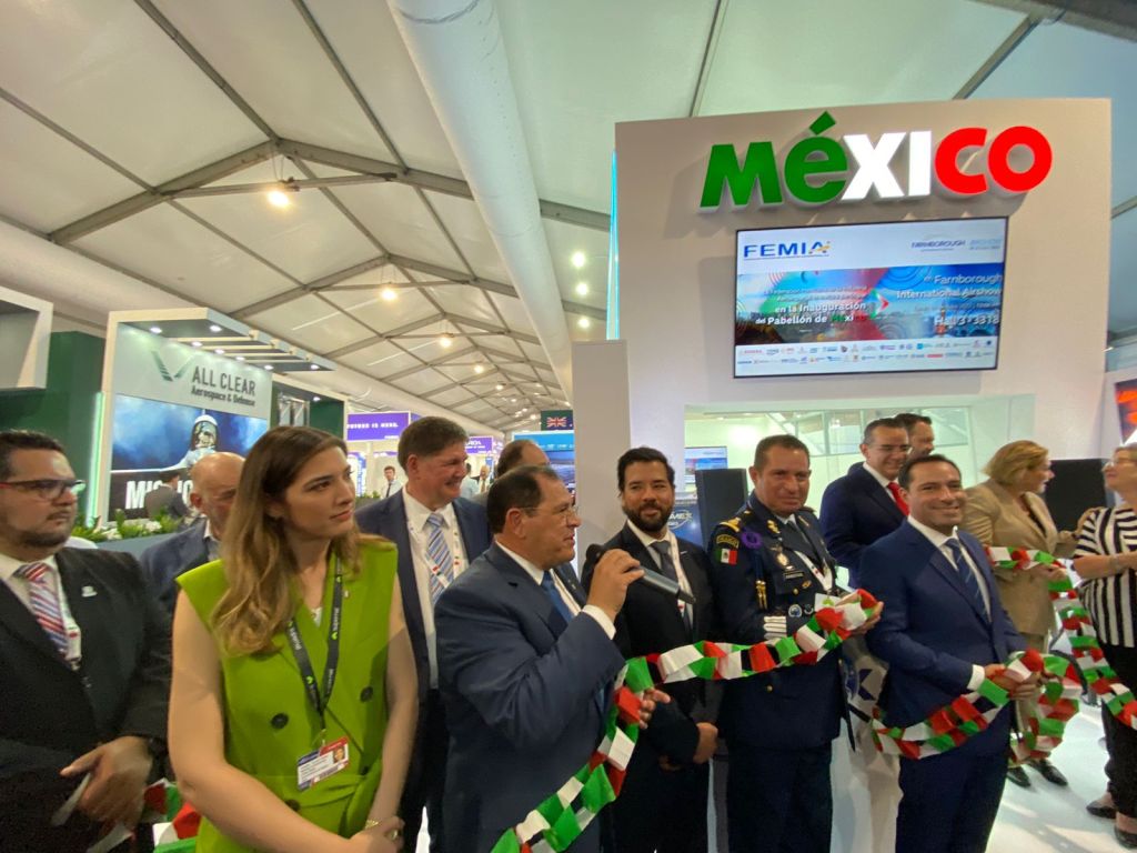 Hampshire, Reino Unido, a 19 de julio del 2022. La Federación Mexicana de la Industria Aeroespacial (FEMIA) inauguró el Pabellón de México en el salón aeronáutico Farnborough International Airshow 2022, en el que acompañado por una comitiva mexicana, busca potenciar las oportunidades y dar a conocer las ventajas competitivas del país en la industria aeroespacial.