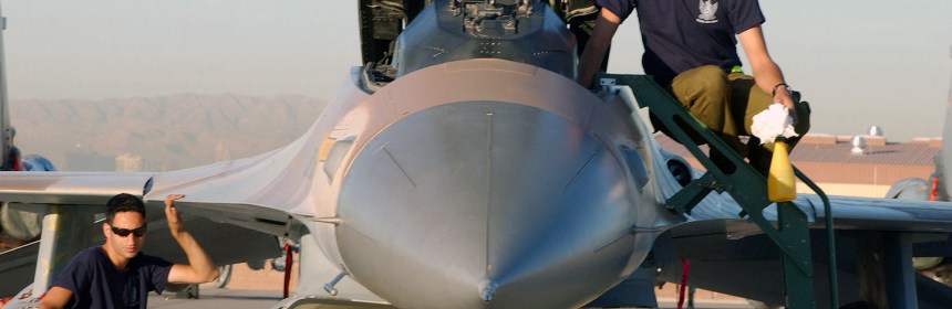 Israeli Air Force (IAF) F-16 Fighting Falcon aircraft Crew Chiefs, Master Sergeant (MSGT) Omar Terezzi (left) and IAF MSGT Koby Hazizia, conduct a preflight inspection of their aircraft during Exercise RED FLAG 2003, on the flight line at Nellis Air Force Base (AFB), Nevada (NV). Red Flag is currently the most realistic simulated air-warfare training exercise held anywhere in the world. It regularly involves the air forces of the United States and its allies.